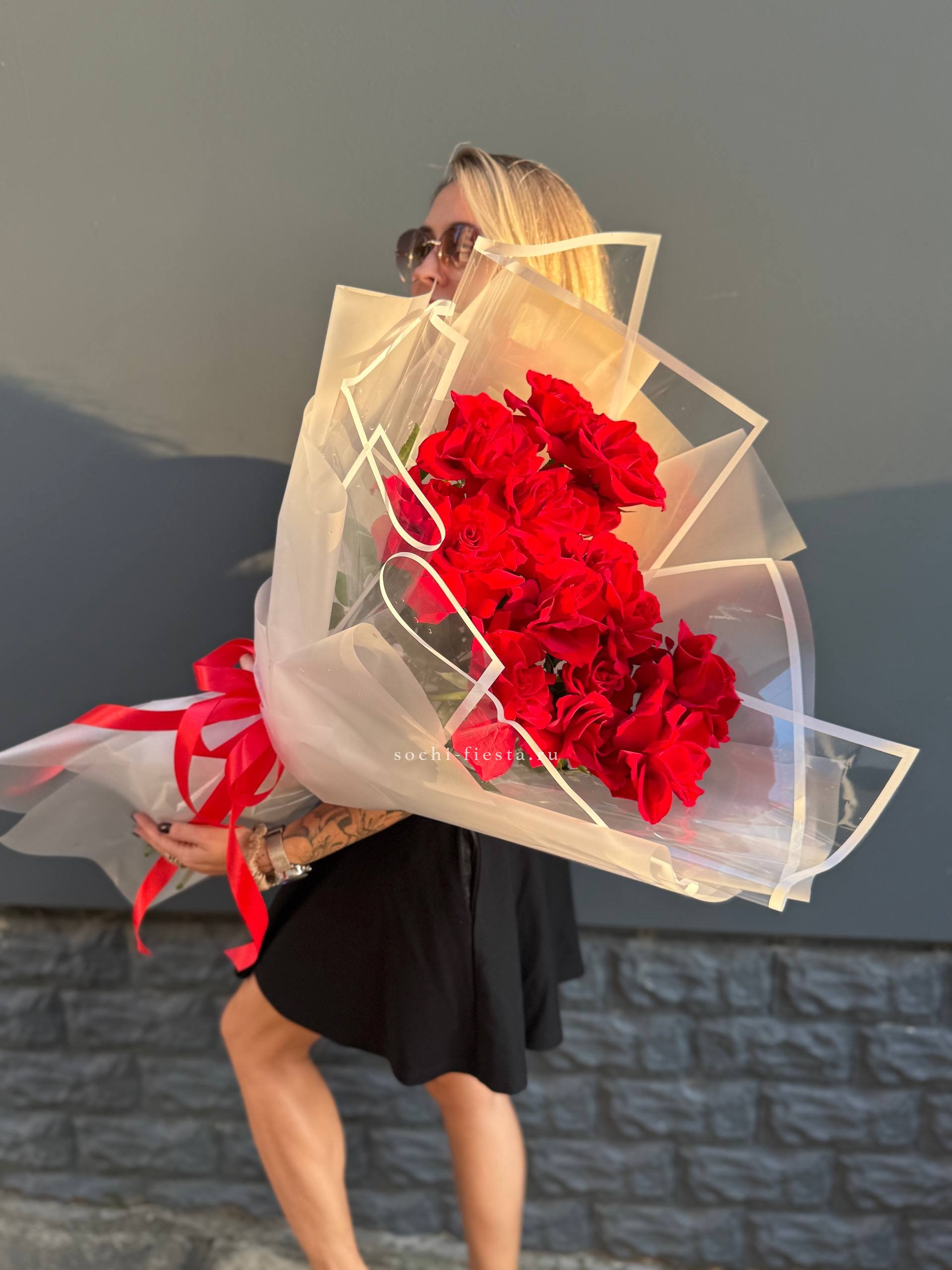 Пятнадцать стеблей собраны в лаконичную форму под прозрачной плёнкой. Букет держит линию и остаётся свежим долгое время благодаря качеству бутонов.