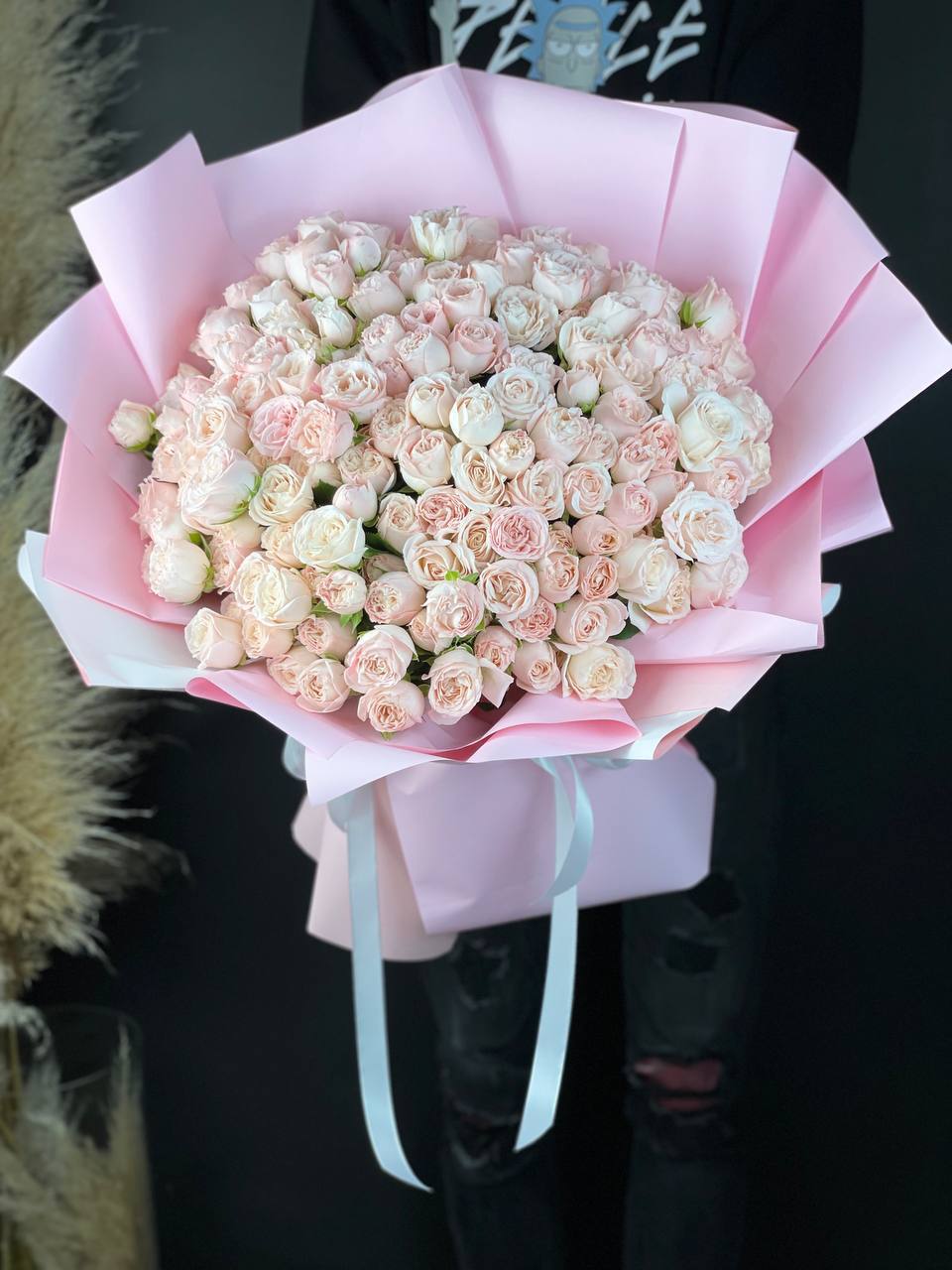 Пятьдесят одна кустовая роза собрана в плотный купол с множеством мелких бутонов на каждой ветке. Пышная композиция с ветками эвкалипта создает объемную форму и наполняет пространство свежестью. Яркий жест для тех, кто ценит масштаб и щедрость