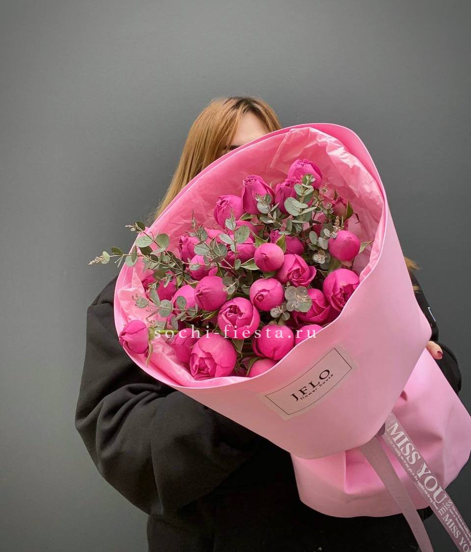 9 пионовидных роз Мисти Бабблс, эвкалипт, зелень, дизайнерская упаковка, лента.