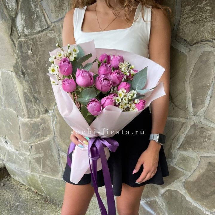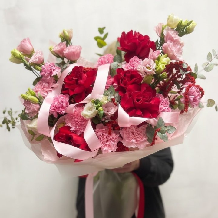 Основа сборных букетов в Ставрополи: розы (Freedom, Mondial, Avalanche), хризантема кустовая, альстромерия, эустома, фрезия, вероника. Дополнительно — ранункулюсы в сезон, хризантема одиночная, ирис весной, тюльпаны в апреле. Состав зависит от текущей поставки и сезона. Флорист всегда предлагает то, что в лучшей форме прямо сейчас.