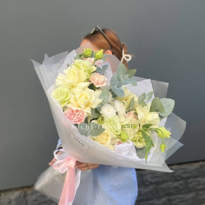 Основа сборных букетов в Ставрополи: розы (Freedom, Mondial, Avalanche), хризантема кустовая, альстромерия, эустома, фрезия, вероника. Дополнительно — ранункулюсы в сезон, хризантема одиночная, ирис весной, тюльпаны в апреле. Состав зависит от текущей поставки и сезона. Флорист всегда предлагает то, что в лучшей форме прямо сейчас.