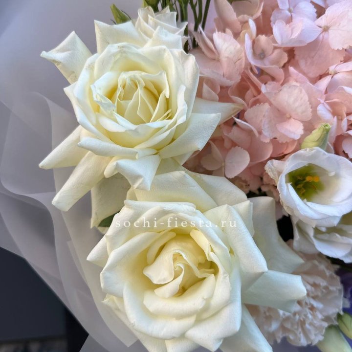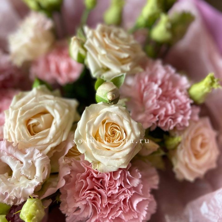 Основа сборных букетов в Ставрополи: розы (Freedom, Mondial, Avalanche), хризантема кустовая, альстромерия, эустома, фрезия, вероника. Дополнительно — ранункулюсы в сезон, хризантема одиночная, ирис весной, тюльпаны в апреле. Состав зависит от текущей поставки и сезона. Флорист всегда предлагает то, что в лучшей форме прямо сейчас.