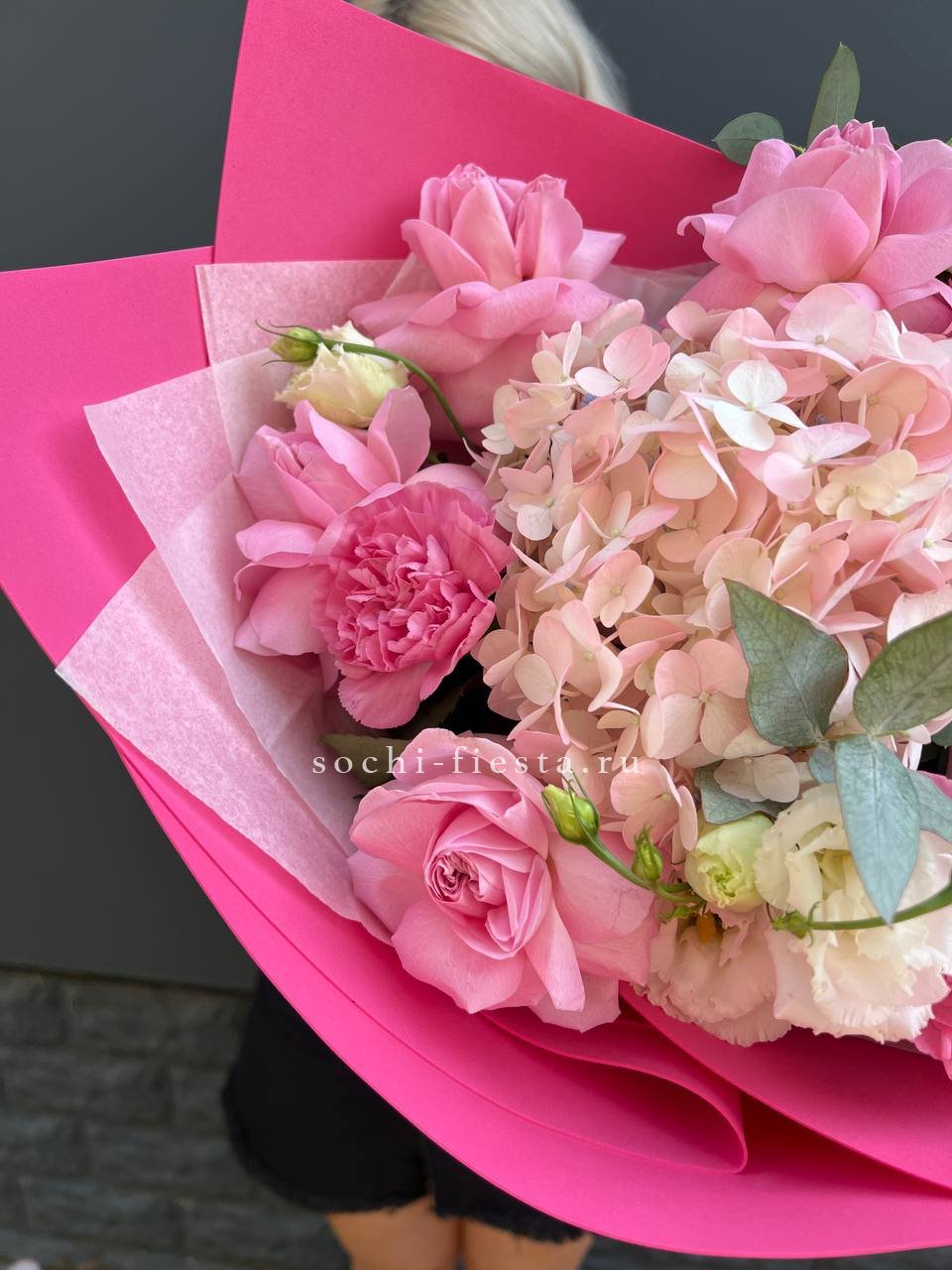 Пушистые шапки Мисти Бабблс переплетаются с классическими розовыми бутонами, создавая объёмный силуэт с мягкими переходами. Композиция собрана плотно, каждый цветок занимает своё место в общем ритме.