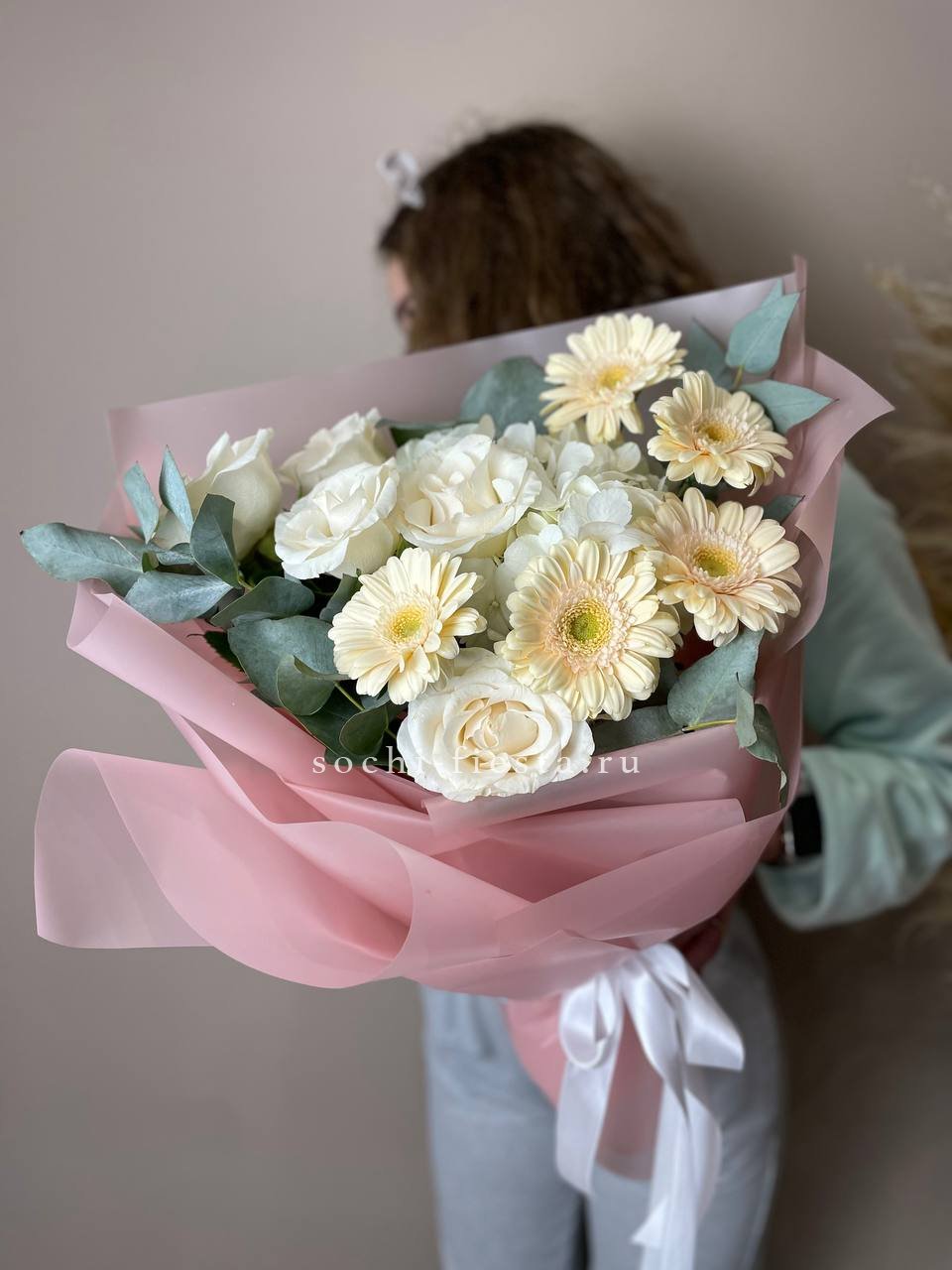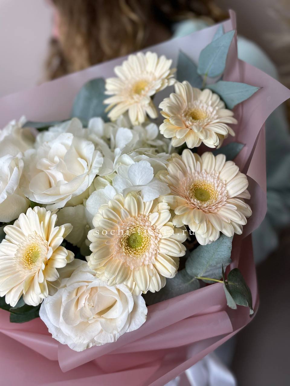 гербера, роза, лилия, озатамус, эвкалипт, упаковка.