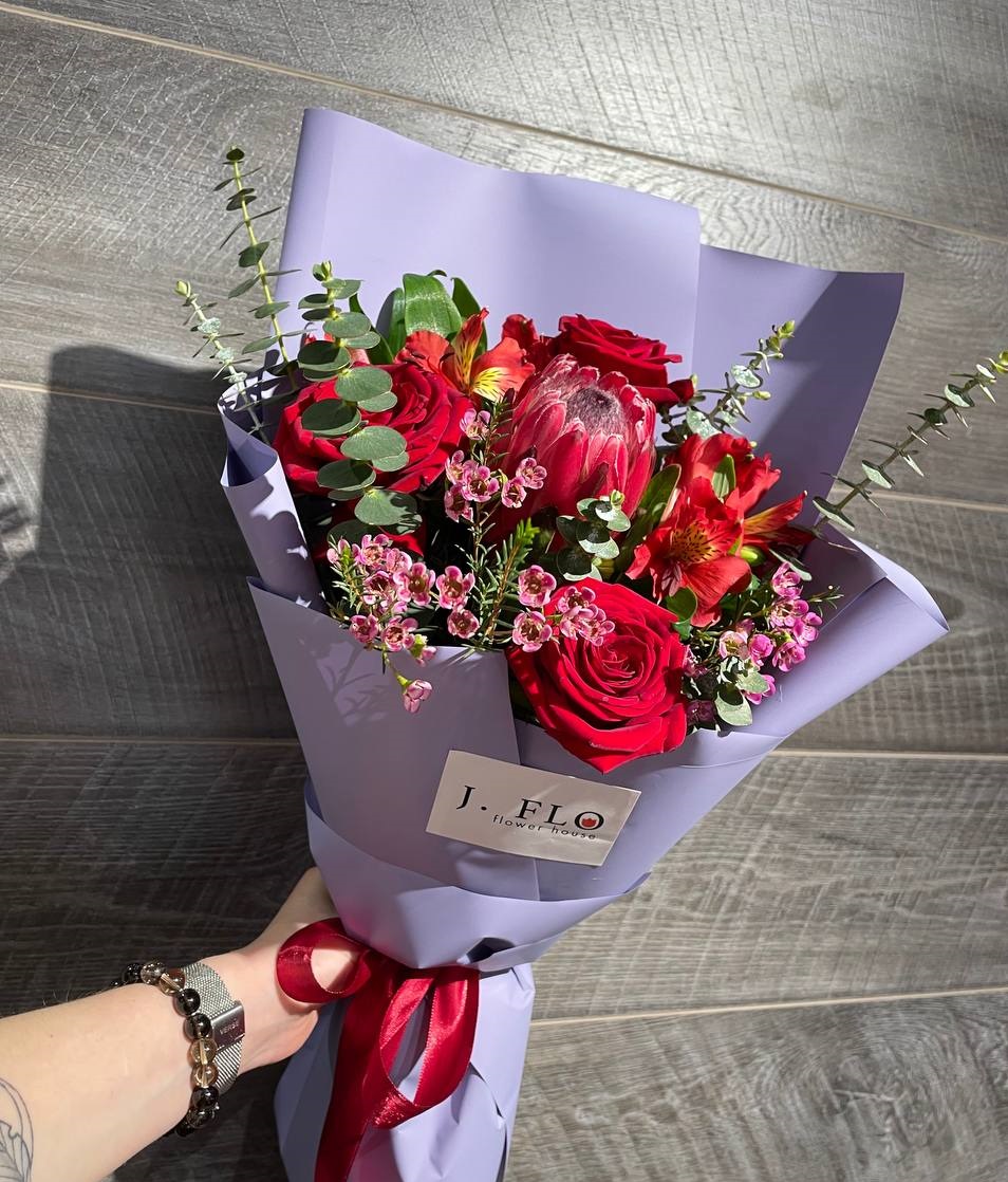 Крупная протея задает ритм всему букету и соседствует с бархатистыми розами и яркой альстромерией. Веточки эвкалипта добавляют легкости и объема этой живописной композиции.