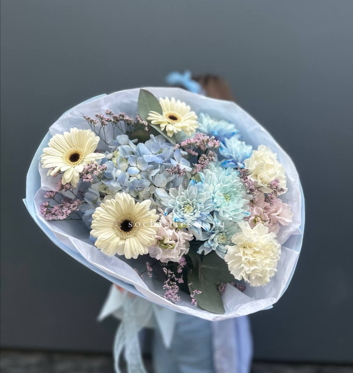 Пионовидные розы Джульетта с пышными шапками гортензии создают плотную композицию в пудровой гамме. Хлопок и лимониум добавляют воздушности, а кустовая хризантема заполняет пространство между крупными бутонами. Букет держит форму и долго сохраняет свежесть.
