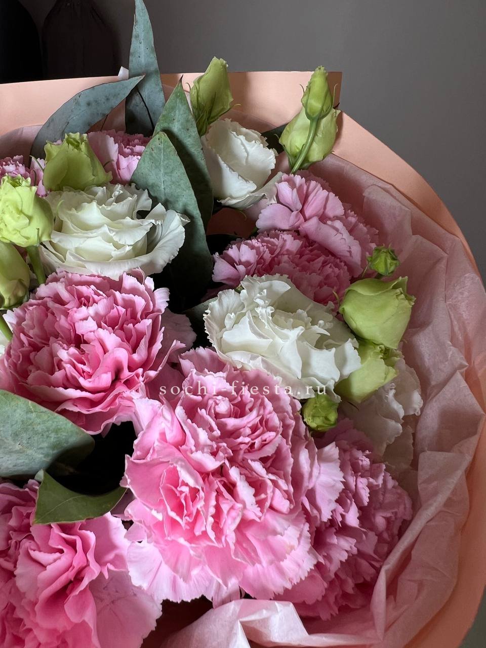 гортензия, роза, гербера, эустома, диантус, дельфиниум, эвкалипт, лента, дизайнерская пленка.