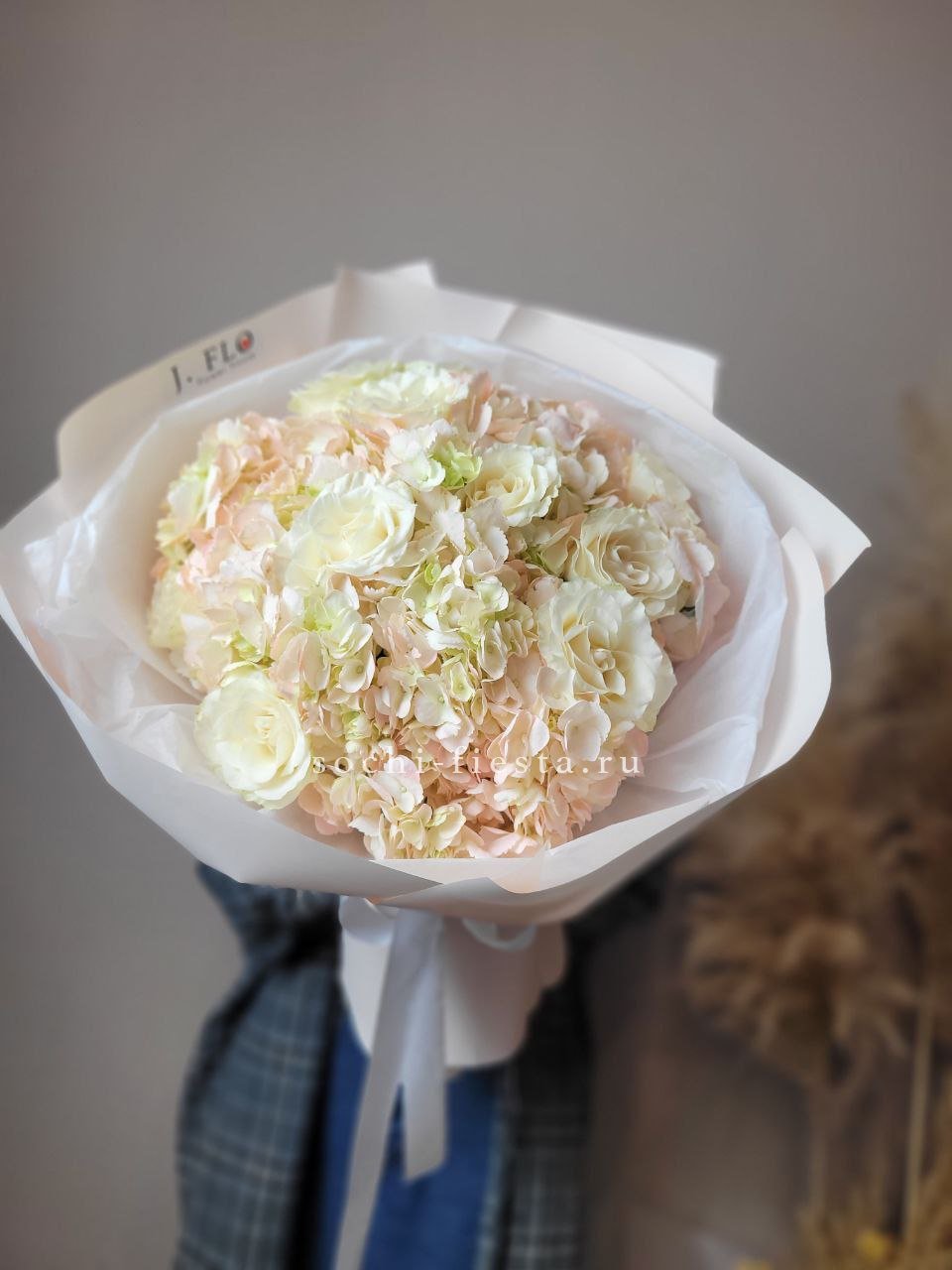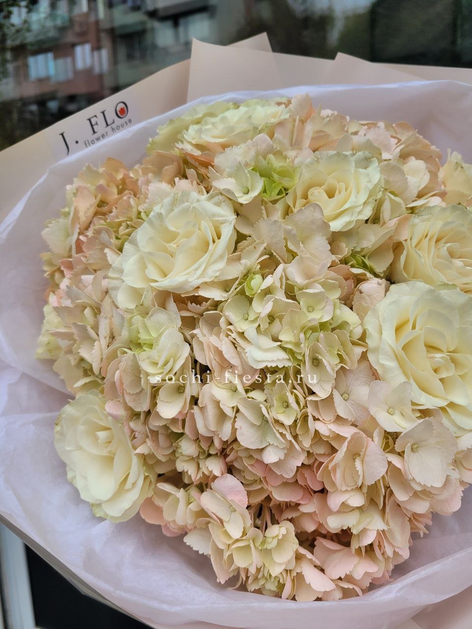Гортензия в компании французских роз с вывернутыми лепестками образует мягкий объём. Бутоны раскрыты неравномерно, что придаёт букету живописную фактуру и естественность.