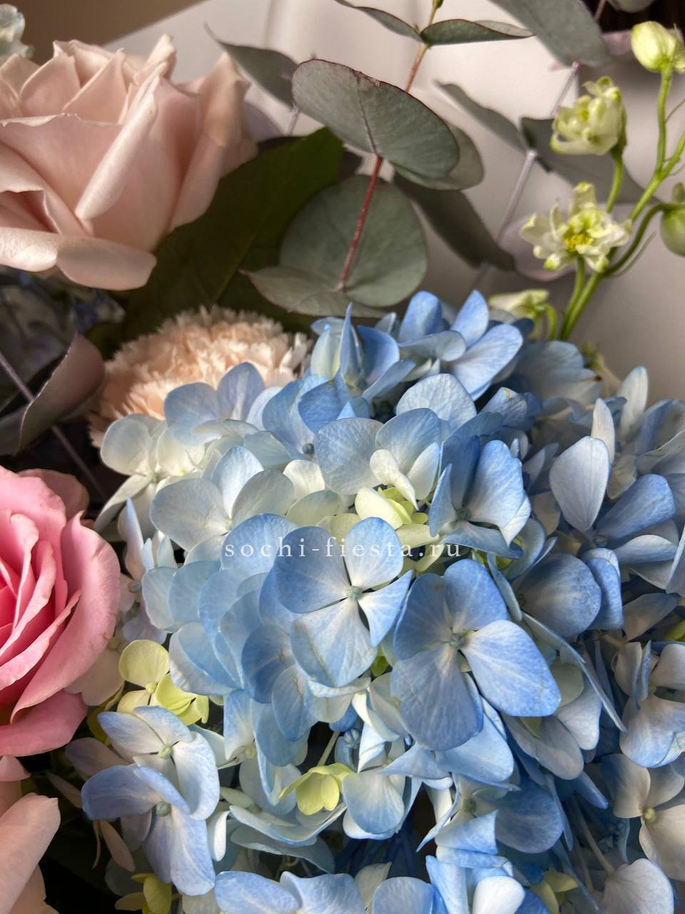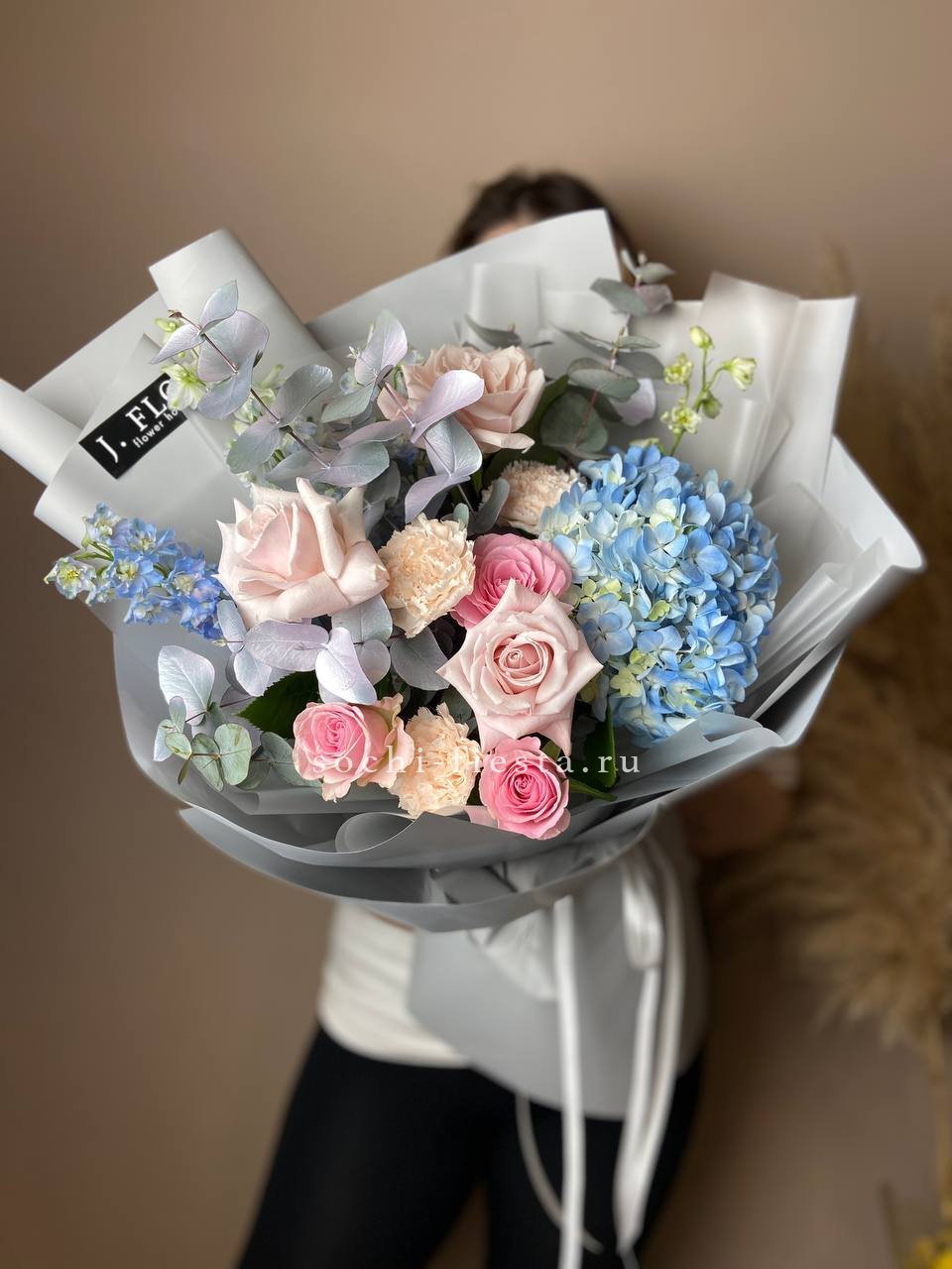 вывернутые розы, дельфиниум, эвкалипт, лента, авторская упаковка.