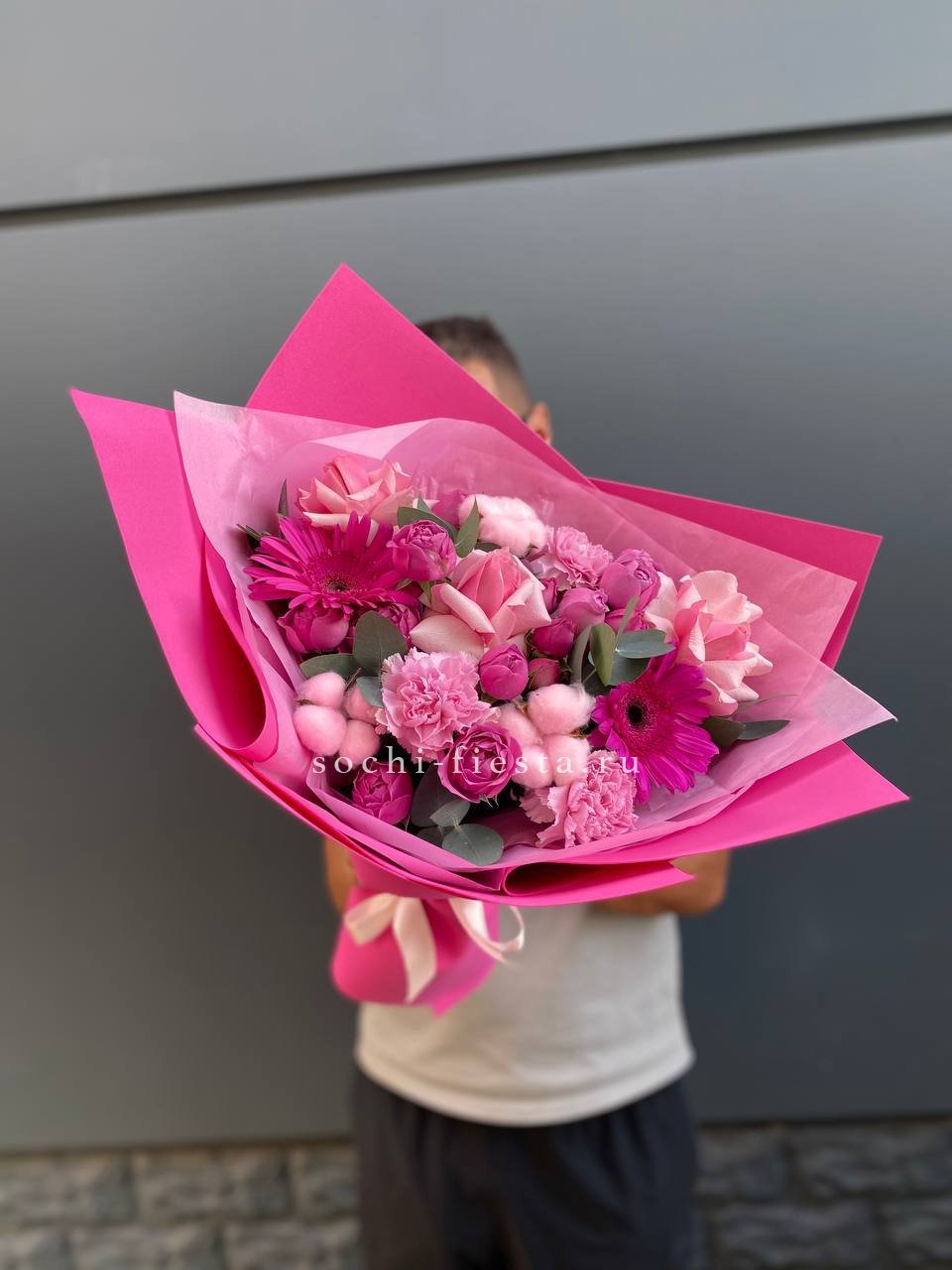 мисти баблс, розы, гербера, диантус, хлопок, упаковка.