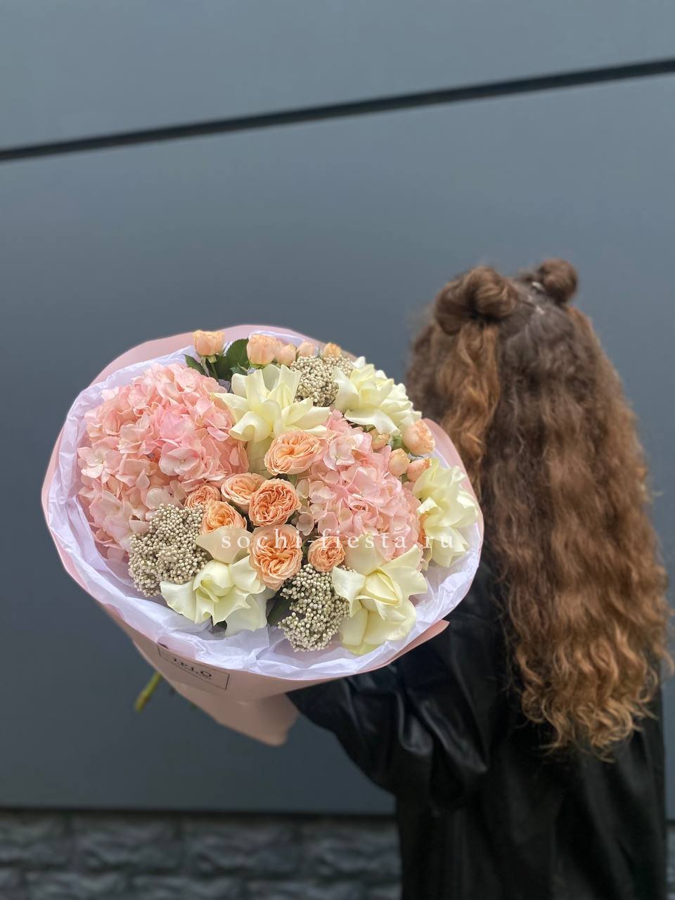 Гортензия обволакивает пионовидные и классические розы мягким облаком. Озотамус добавляет воздушности, создавая объёмную композицию с природной непринуждённостью.
