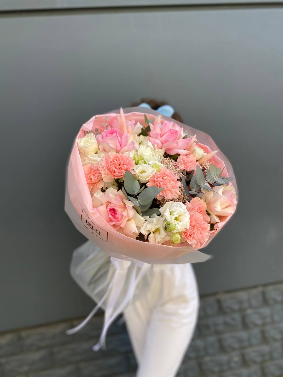 кустовые розы, эустомы, гортензии, альстромерии, лента и дизайнерская пленка.