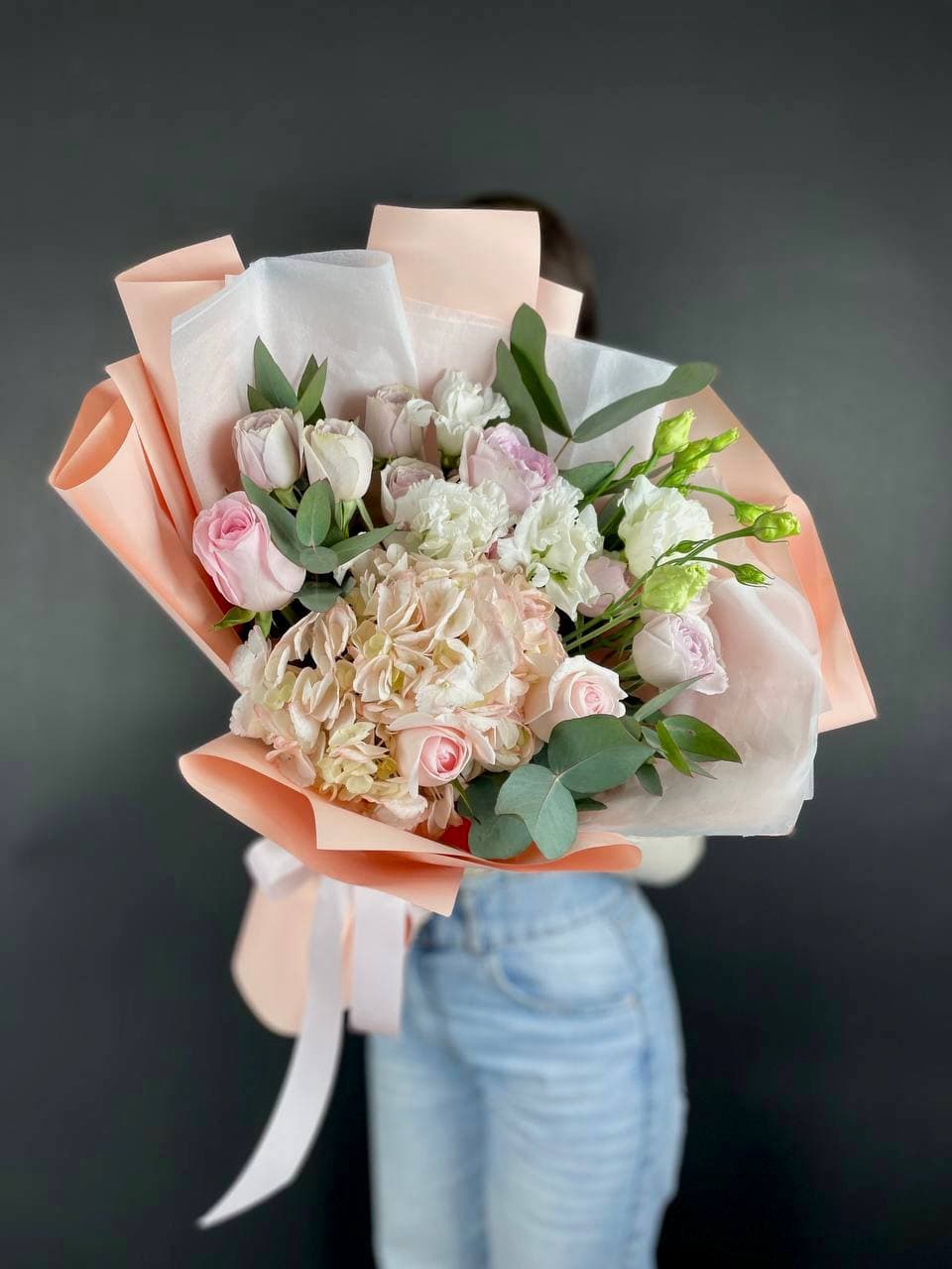 Пышные шапки гортензии задают основной объём, а бутоны роз и эустомы расставлены между ними с лёгкой небрежностью. Эвкалипт добавляет свежести и делает композицию живой.