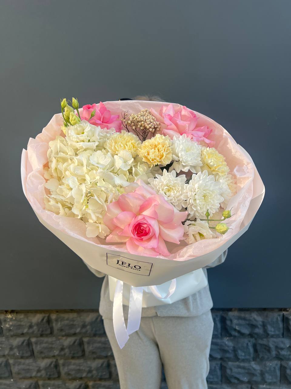 Пионовидные розы и гортензия образуют плотное ядро композиции, а диантус с эустомой разворачиваются по краям. Эвкалипт задает движение и глубину всей формы.