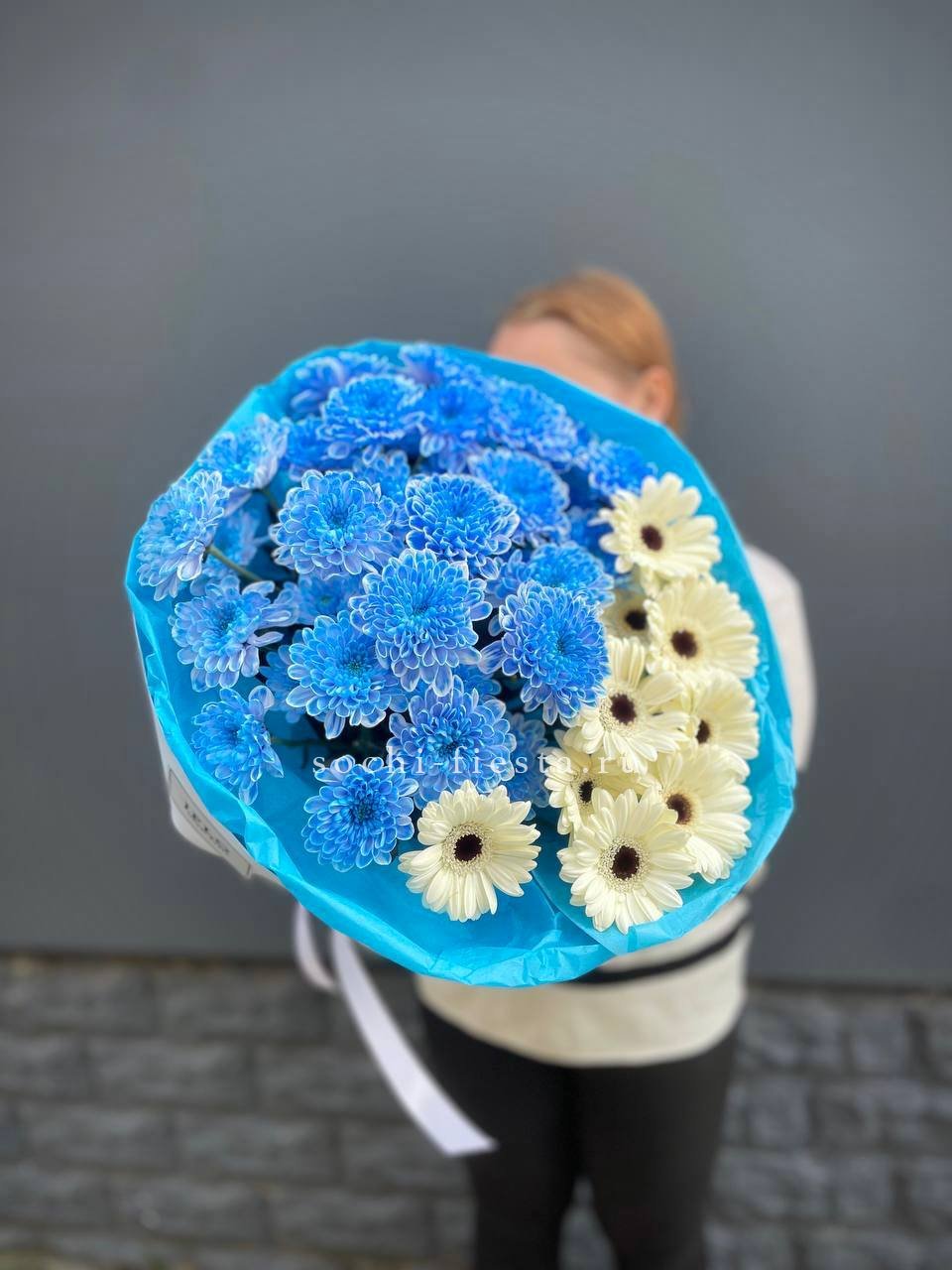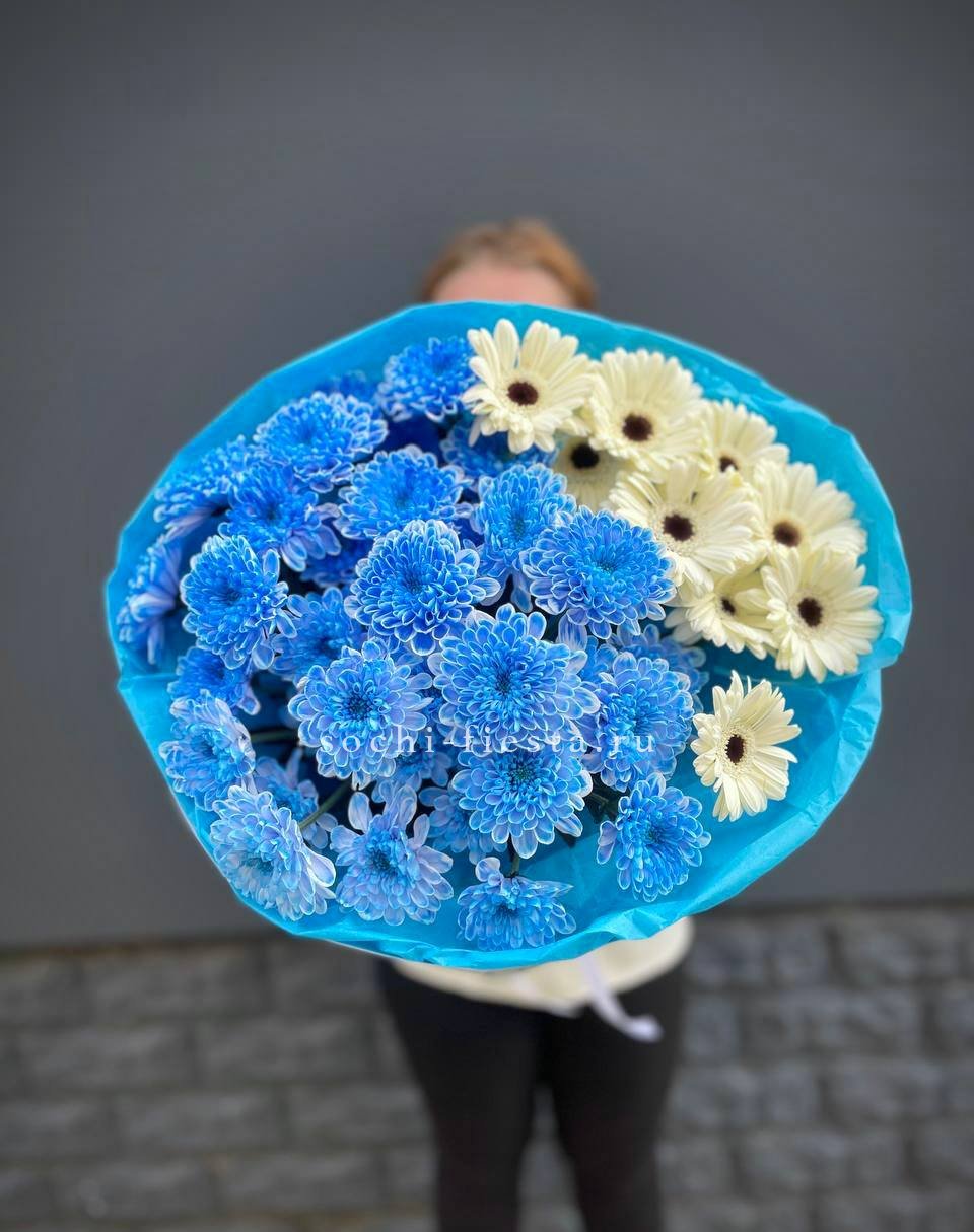 Солнечные герберы встречаются с кудрявыми хризантемами Бигуди в ярком жизнерадостном букете. Эвкалипт добавляет свежести и завершённости всей композиции.