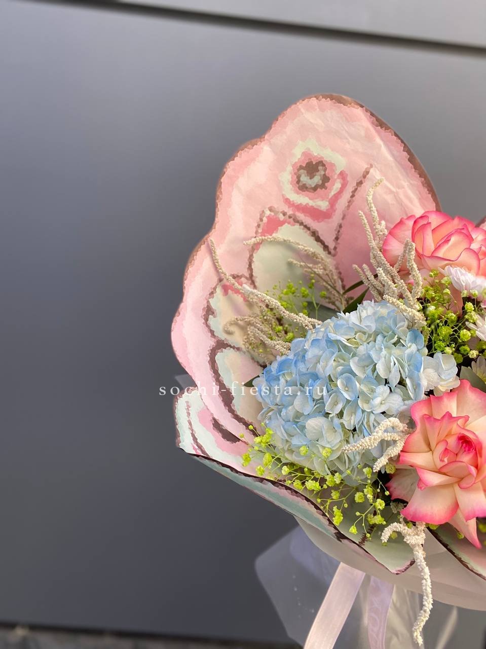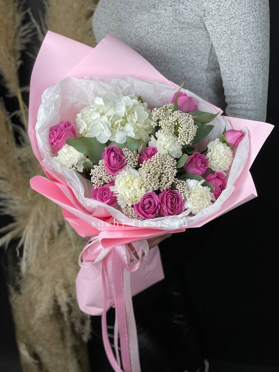 Воздушная гипсофила и струящийся амарантус создают движение вокруг крупных соцветий гортензии и роз Джумилия. Композиция построена на игре объемов и лёгкости линий.