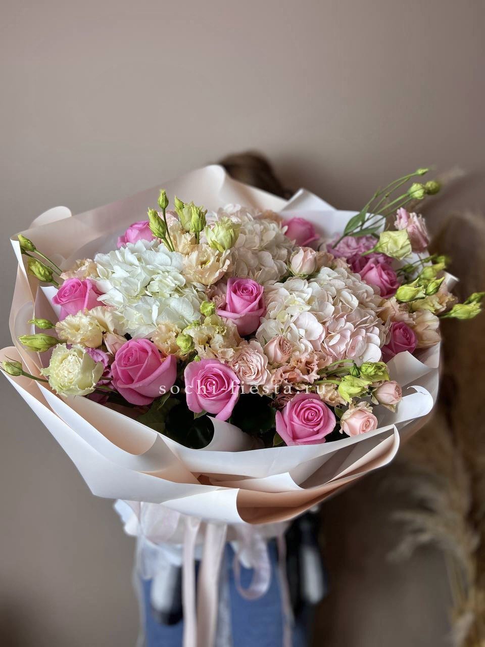 Лилии раскрываются постепенно, эустома добавляет объёма, а розовые розы задают тёплый тон всей композиции.