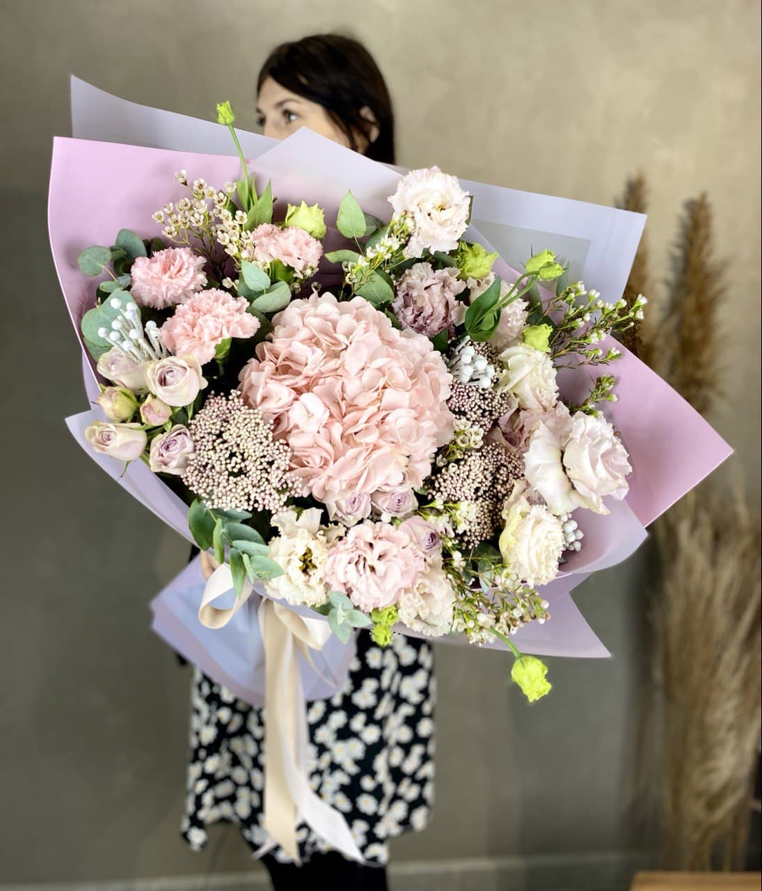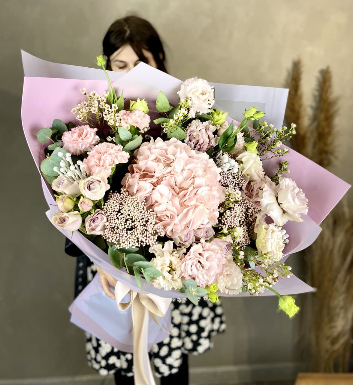 лилии, эустома, розовые розы, эвкалипт, лента, корейская пленка.