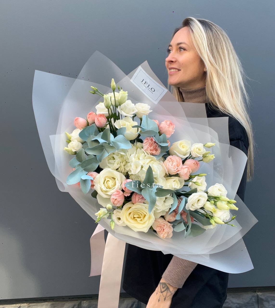 хризантемы, диантусы, розы, эустома, гортензия, лента, корейская пленка.