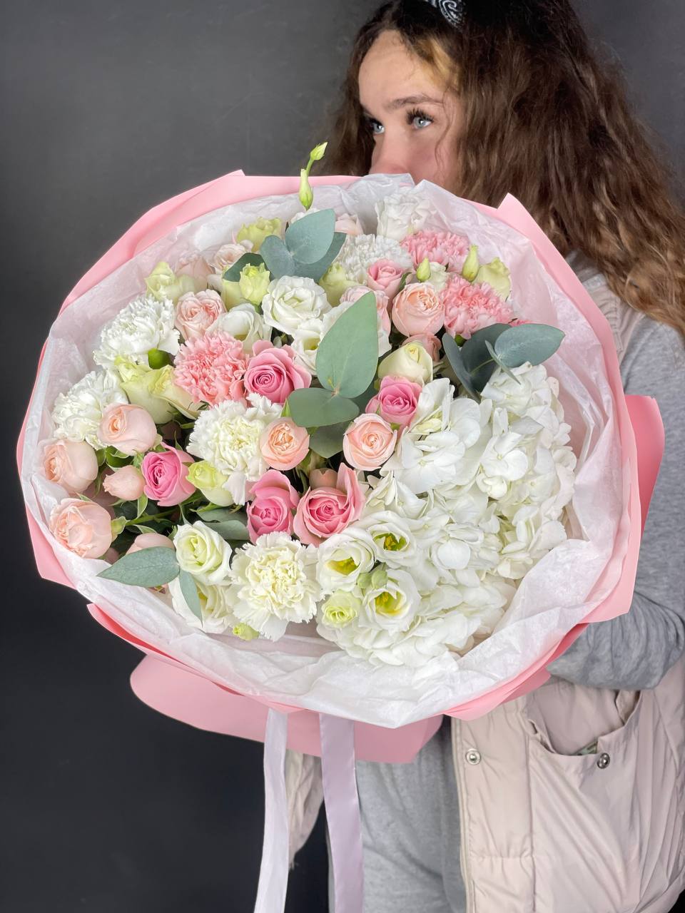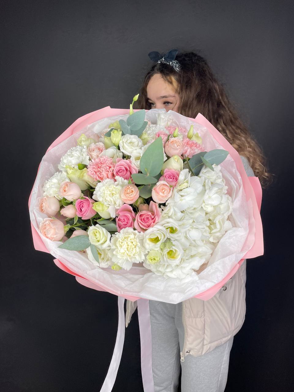 Букет объединяет хризантемы, диантусы, розы, эустому и гортензию в плотную композицию. Корейская пленка удерживает форму и создает графичный силуэт с четкими границами.