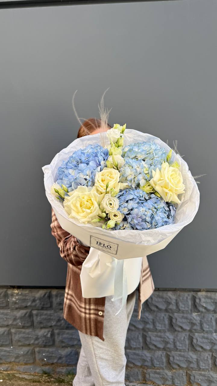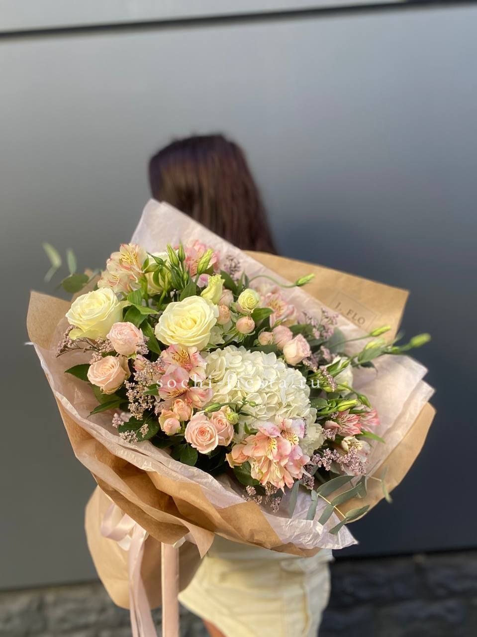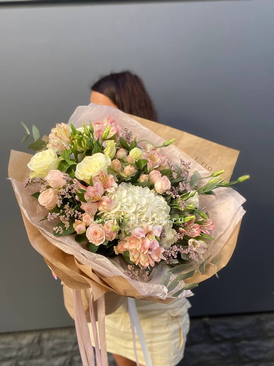Крупные шапки гортензии окружены россыпью кустовых роз и эустомы. Композиция наполнена объемом и удерживает форму благодаря плотной сборке цветов разной высоты.