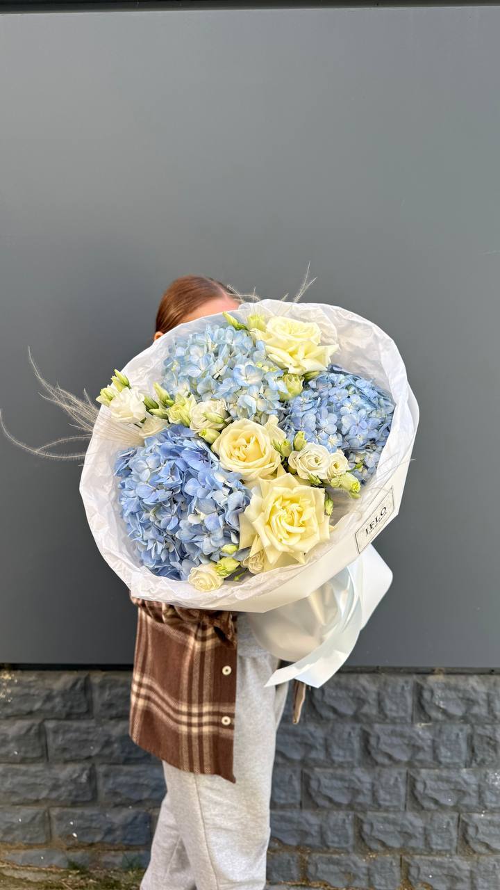 гортензия, эустома, кустовые розы, одноголовые розы, эвкалипт, вспомогательная зелень.