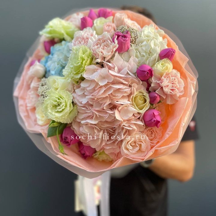 Сезонные хиты в Ставрополи складываются из классической голландской и эквадорской срезки круглый год плюс сезонные акценты. Пионы в мае-июне, гортензия летом, хризантемы осенью, амариллис зимой. Местные тёплые теплицы добавляют свежие позиции в межсезонье.