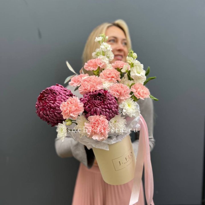Сезонные хиты в Ставрополи складываются из классической голландской и эквадорской срезки круглый год плюс сезонные акценты. Пионы в мае-июне, гортензия летом, хризантемы осенью, амариллис зимой. Местные тёплые теплицы добавляют свежие позиции в межсезонье.