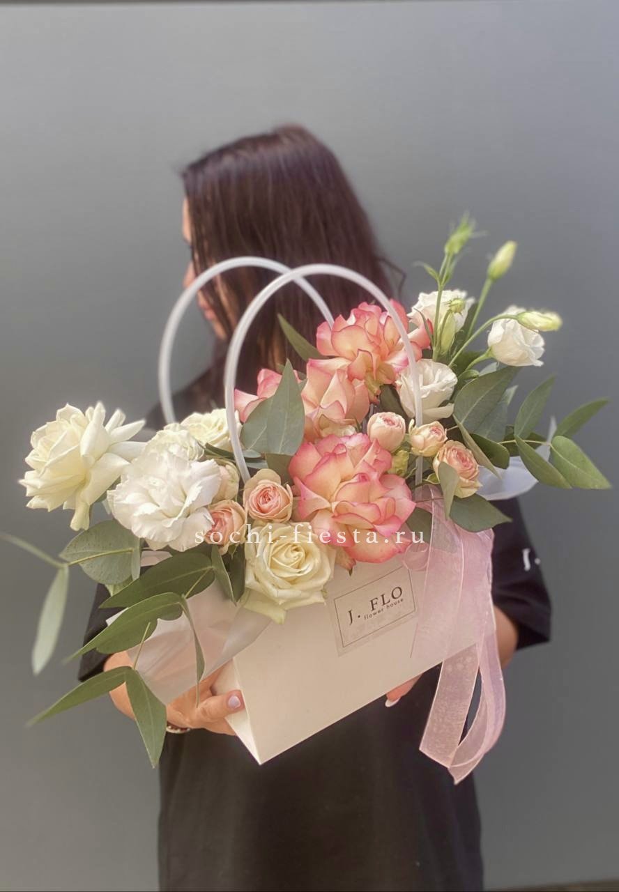 диантусы, розы, эустома, гортензия, эвкалипт, вспомогательные цветы, лента, корейская пленка.